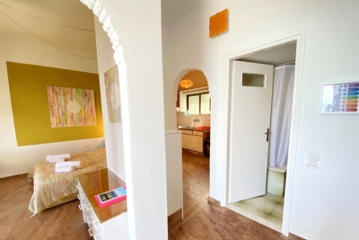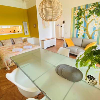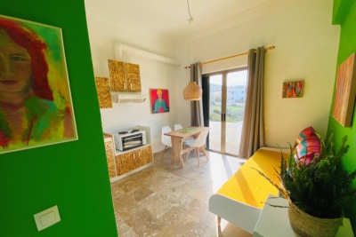 Beachfront Apartment with Sea View The Green Apartment at The Beachhouse Apartments offers a spectacular sea view and features a double bed and two air conditioning units, providing cooling or heating in both the bedroom and kitchen/living area. The apartment offers an inspirational and colorful environment, reflecting the energy of the Heart chakra. Its decor includes vibrant green tones and artwork in Lizzy's signature style, creating a unique and inspiring space that encourages creativity. The apartment also includes a nice bathroom and a balcony, adding to the comfort and rejuvenating atmosphere of the space.