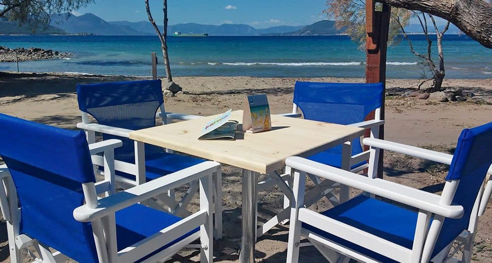 The covered terrace of La Palma is tucked away under the trees, a perfect place to cool down and to releax or play a game of "tavli" Greek backgammon. La Palma is serving breakfast, salads, snacks, appetizers, pizza, plates with a variety of snacks (their most popular plate!), main dishes, deserts, coffees/ beverages, ice creams, milk shakes, refreshments, beers, juices, fresh juices, drinks and cocktails. Their La Palma "Biftekia", traditional Greek beef burgers with fresh fried potatoes, small pies, tomato sauce & yoghurt, as well as their Chicken fillets with grilled vegetables & fresh fried patatoes are highly recommended.